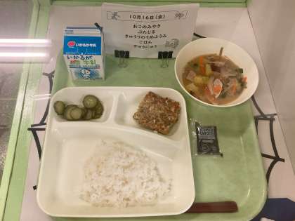 金曜日の献立は、お好み焼き、豚汁、きゅうりの梅風味、ご飯、牛乳でした。