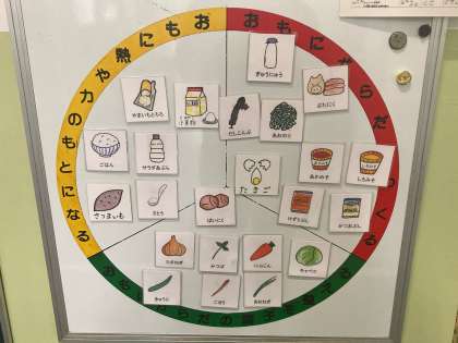 2枚目の写真は、この日の給食に使われていた食材を黄・赤・緑の三食食品群にわけて表示しているものです。