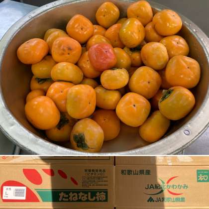 画像1:給食室に届いた柿です。59個ありました。和歌山県産の柿でした。