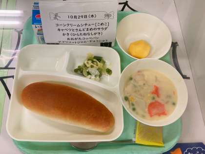 画像3:今日の給食です。コーンクリームシチューも「あったかくておいしい」と好評でした。