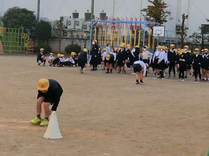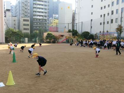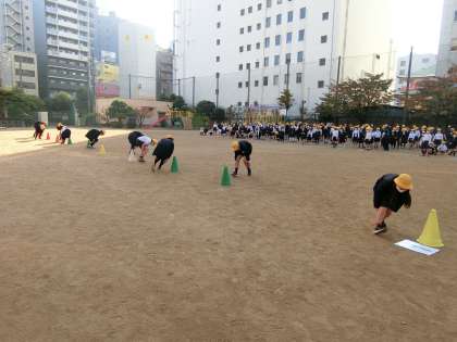 〇「足つかみ」リレーをたてわり班対抗で楽しみました。