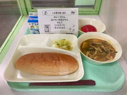 12月9日の給食は、カレーうどん、はくさいのおひたし、りんご、黒糖パン、牛乳でした。