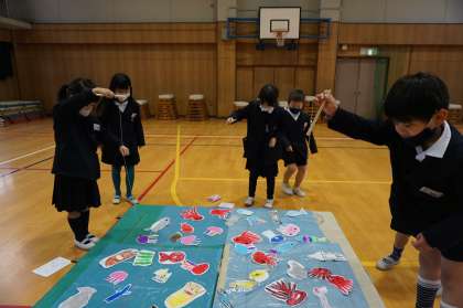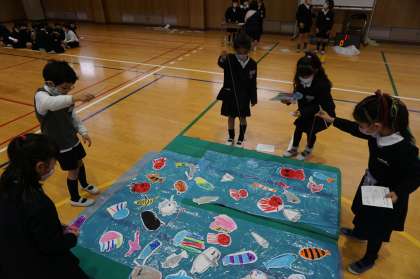 今日は、なんもとまつりでするはずだったお店「おさかなパーク」を1年1組のみんなで楽しみました。自分たちが作った海の生き物にクリップを付け、磁石を先に付けた竿で釣り上げます。