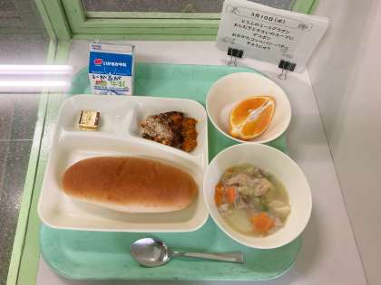 3月10日の給食は、とうふのミートグラタン、押麦と野菜のスープ煮、デコポン、大型コッペパン、バター、牛乳でした。