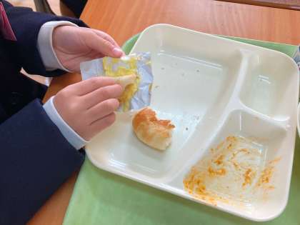 今日はパン添加物として、バターもついていました。パンを一口分ずつちぎって、上手にバターをつけて食べていました。