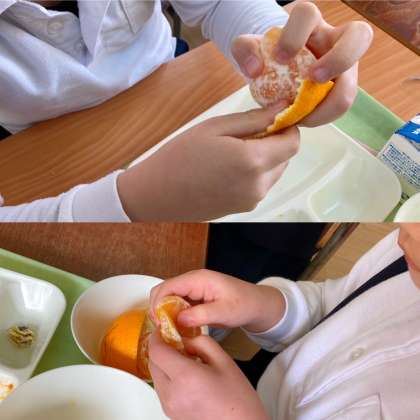 1年生も少し慣れてきたようで、親指を上手に使って外側の分厚い皮をむき、一房ごとにわけて食べていました。「おいしい〜!」とおかわりしている子もいました。
