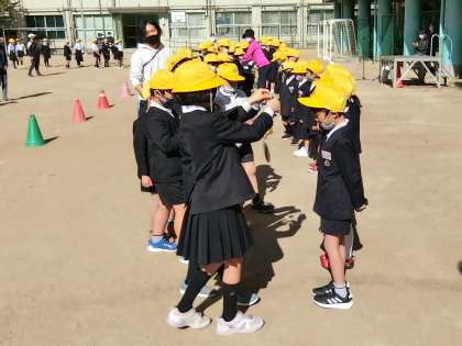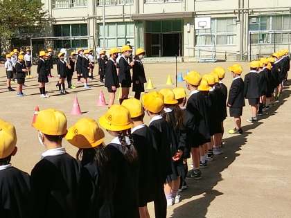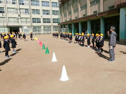 児童朝会後、運動場に1年生を迎えて対面式を行いました。