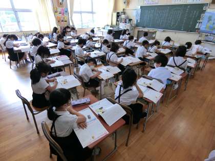6月の玄関掲示:制作担当は6年生 蛍が舞う季節ですね。