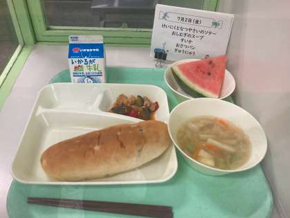 7月2日の給食は、豚肉と夏野菜のソテー、押麦のスープ、すいか、おさつパン、牛乳でした。