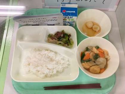 月見の時にお供えする「いも」と「だんご」を使った「一口がんもとさといものみそ煮」、「みたらしだんご」が出ました。