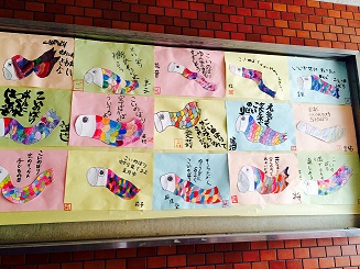 ゴールデンウィーク前の5月1日に図工と国語の学習でこいのぼりの掲示物を一人1点ずつ作成しました。