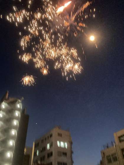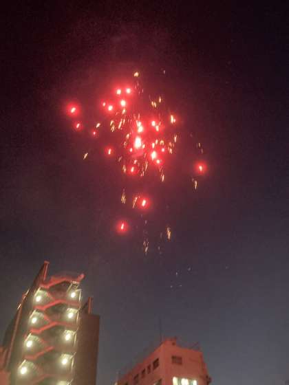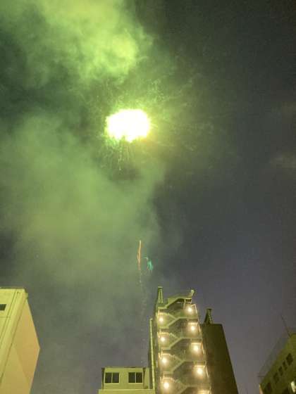 ○東の空に下弦の月が色とりどりの花火を見守っていました。