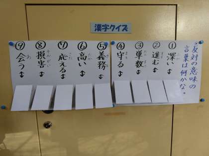 〇今日の漢字クイズは反対語、子どもだけでなく保護者の皆様もお楽しみください。