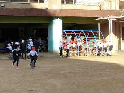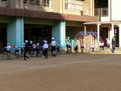 ・6年生が1年生に一輪車の乗り方指導をしました。