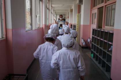 給食中の約束を確認した後、手洗いや着替えを済ませて給食を取りに行きました。
