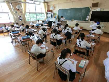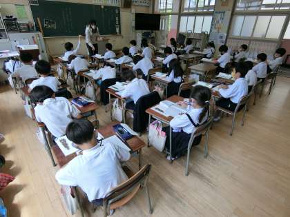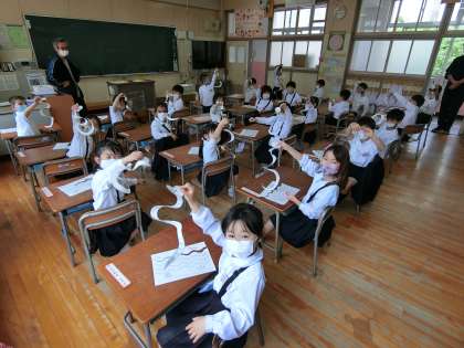 〇1年1組では、紙に書かれた線に沿ってはさみで切り取る学習をしていました。できあがった「へび」を見せてくれました。校長 牧