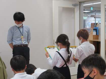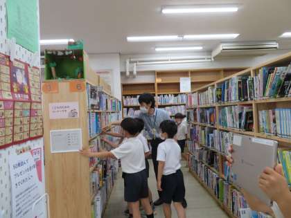 生活科の学習で浪速図書館に町たんけんに行きました。図書館の方に質問をしたり、図書館の中を見学したりしました。また、たくさんの本の中から自分の読んでみたいものやおすすめされた本を探していました。
