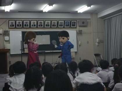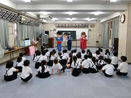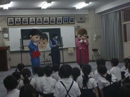 大阪府警の生活安全指導班の方に、誘拐などの被害に子どもたちがあわないためにどうするのかということを教えてもらいました。着ぐるみなどを使って教えてくださったので、子どもたちもよくわかったようです。