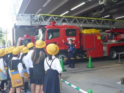 浪速消防署に見学に行きました。校区内にあるので通ったことはありますが、中の施設を見学をするのは初めてでした。