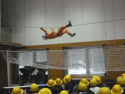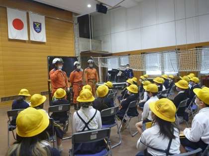 地域の安全を守ってくれている消防署の方々のお仕事について教えていただきました。救助隊の方々の訓練も見せていただき、その姿に驚きの声をあげていました。