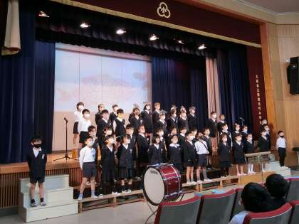 前半の部では3年・1年・5年の順に発表し、その様子を2年・4年・6年が鑑賞しました。