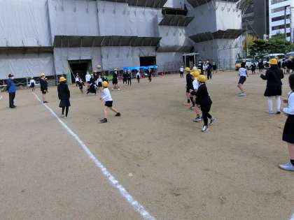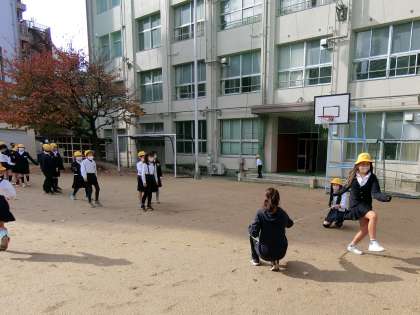 ・10のたてわり班に分かれて、ゴムだん、ドッジボール、おおなわを楽しみました。