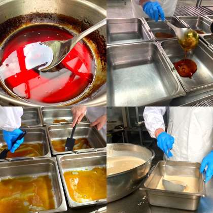カラメルソースをバットにまんべんなくひろげ、上からプリン液を流し入れます。