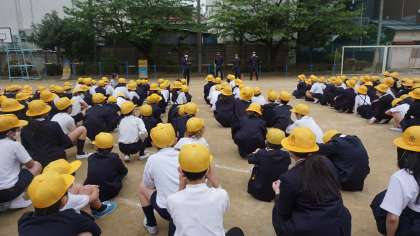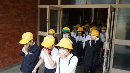 放送の指示に従い、ハンカチを口にあて、「お・は・し・も」の約束を守り、静かに素早く運動場に避難することができました。