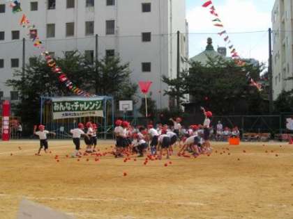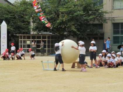 大玉ころがしでは、自分たちの体ほどの大きな玉を協力して運びました。