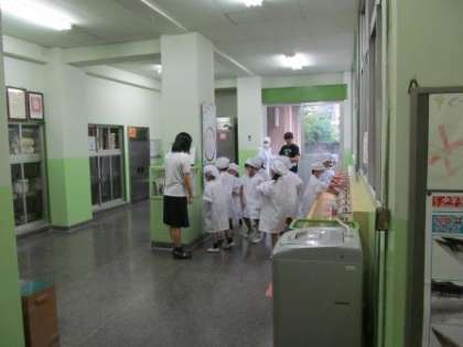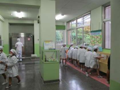 12:35 給食調理室前の児童だまり(給食調理室から給食を受け取る場所)の様子です。給食当番はここで一斉に手洗いをしてから給食を受け取ることになっています。各教室横の狭い手洗い場所で一斉にするより、衛生的で確実に早く手洗いを済ませることができます。