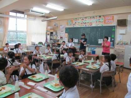 きょうは、○○君のたんじょうび。みんなでハッピーバースデイの歌を歌って、元気にいただきます。