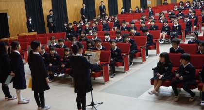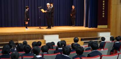 式では校長先生からのお話、冬休みの生活に関するお話、2・3年生の代表児童から2学期に楽しかったこと、がんばったことなどについてスピーチがありました。