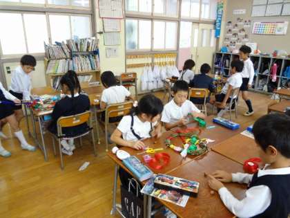 きのう収穫したさつまいものつるを使ってリースをつくりました。班の仲間と協力して楽しくリースづくりができました。