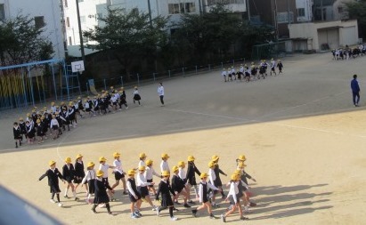 朝会の最後は、集団行動の学習。学年でまとまって行進の仕方を確認しながら運動場を一周して教室へ向かいます。