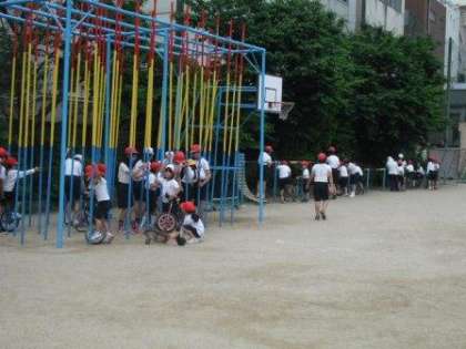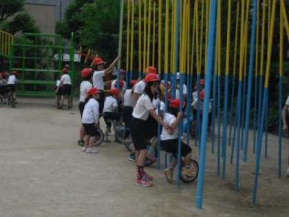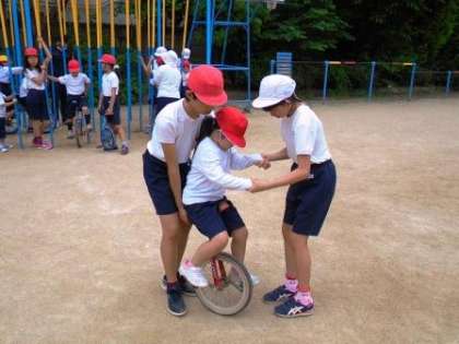 ついに、1年生が一輪車デビューをしました!本校では、一人に一台一輪車を割り当て、全校で一輪車の練習に取り組んでいます。6年生のお兄さん・お姉さんがやさしく乗り方を教えてくれたり、一輪車のサドルの調整をしてくれました。