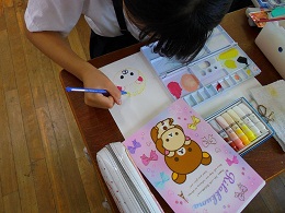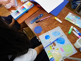 図工の学習で一人ひとりオリジナルの「マイ コースター」を作っています。半径4cmの円の中に、筆先のみを用いて描いていっています。