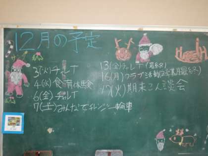 休み時間、気が付くと12月行事予定を書いた背面黒板に、掲示係の子どものほかに何人もの子ども達が集まり、楽しそうに絵を描き始めています。