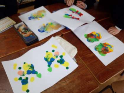 紙に直接絵の具を塗りつけ、それを二つ折りにしたり、別の紙を乗せたりして、塗りつけた絵の具を転写します。