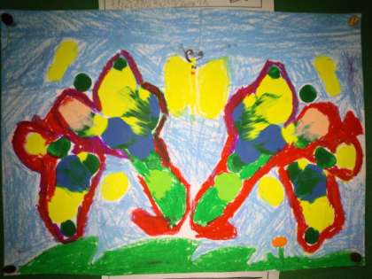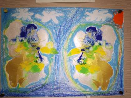 写真左(画用紙に絵の具を乗せ、転写し、開いたところ。)