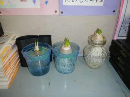 クラスで育てている水栽培のヒヤシンスも少し芽が出てきました。