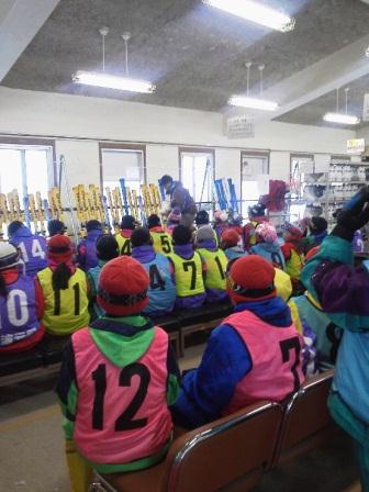 指導員さんから、ブーツやスキーのはき方を指導していただいています。