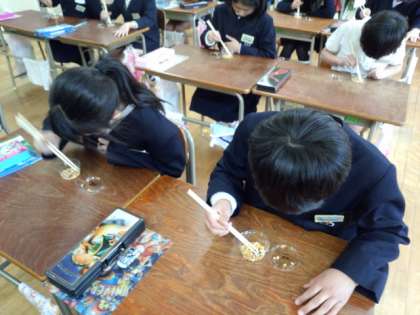 プラケースに入ったポップコーンの種を、竹箸でつまんで移動しているんです。