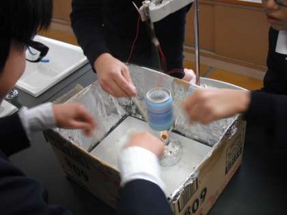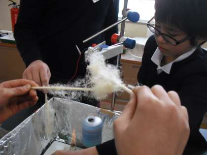 わたあめ器を3時間かけて作りました。モーターと穴をたくさんあけた空き缶をつなぎ、その空き缶の中にザラメ糖を入れてアルコールランプで温めます。そして、モーターを回すと勢いよく空き缶が回って・・・見事に実験成功!!「来週も作りたい」と子どもたちは大満足でした。