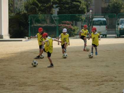 2年生では、体育の時間にボールけりゲーム(サッカー)の学習が始まりました。今日は、ボールタッチやドリブルの練習をしました。1時間ですが、ボールの扱いが上達しました。
