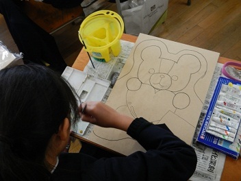 ホワイトボードやコルクボードを取り付けることができるとっても欲張りな木のボードです。子ども達は、自由に作品をイメージして下書きを行い、絵具で色を塗っています。