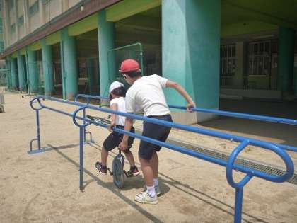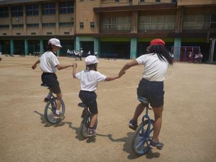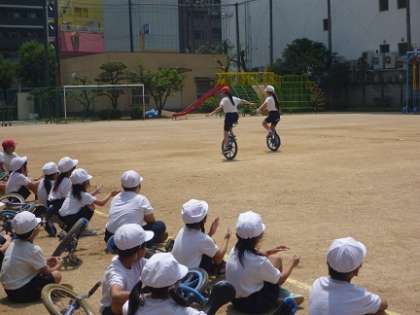 今日は、6年生が1年生に一輪車を教えてくれました。