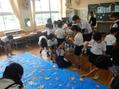 お店の担当の子ども以外は、たてわり班に分かれてお店をまわります。5・6年生が下級生の意見を聞いたり、優しくしたりしている姿が印象的でした。