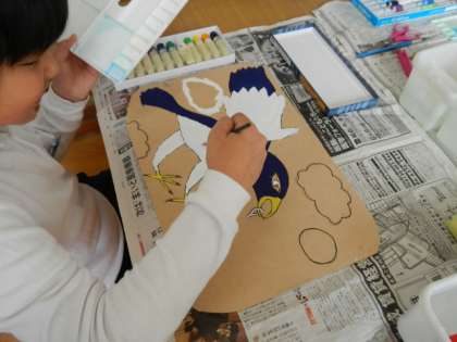 板を電気のこぎりで裁断したり、絵具を使って色を塗ったりしています。
