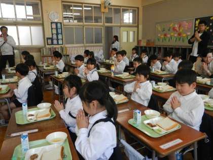 4月10日(火)、今日から給食が始まりました。1年生にとっては初めての給食です。4時間目に栄養教諭の石見先生から給食について話があった後、給食着を着る練習をしました。まっさらの給食着なのでボタンなどが硬くて少し苦労しました。4時間目が終わったら6年生のお兄ちゃん、お姉ちゃんが来てくれ、一緒に牛乳や食器やおかずを運んでくれました。でも配膳は自分たちでします。食缶からおかずやスープを分けるのは初めての経験でしたが、結構上手にできました。