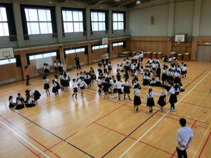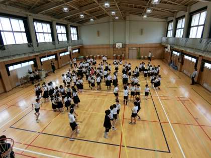 進行役の集会委員の掛け声のあと、猛獣の名前を言い、その文字数にあった人数でグループを作り座ります。